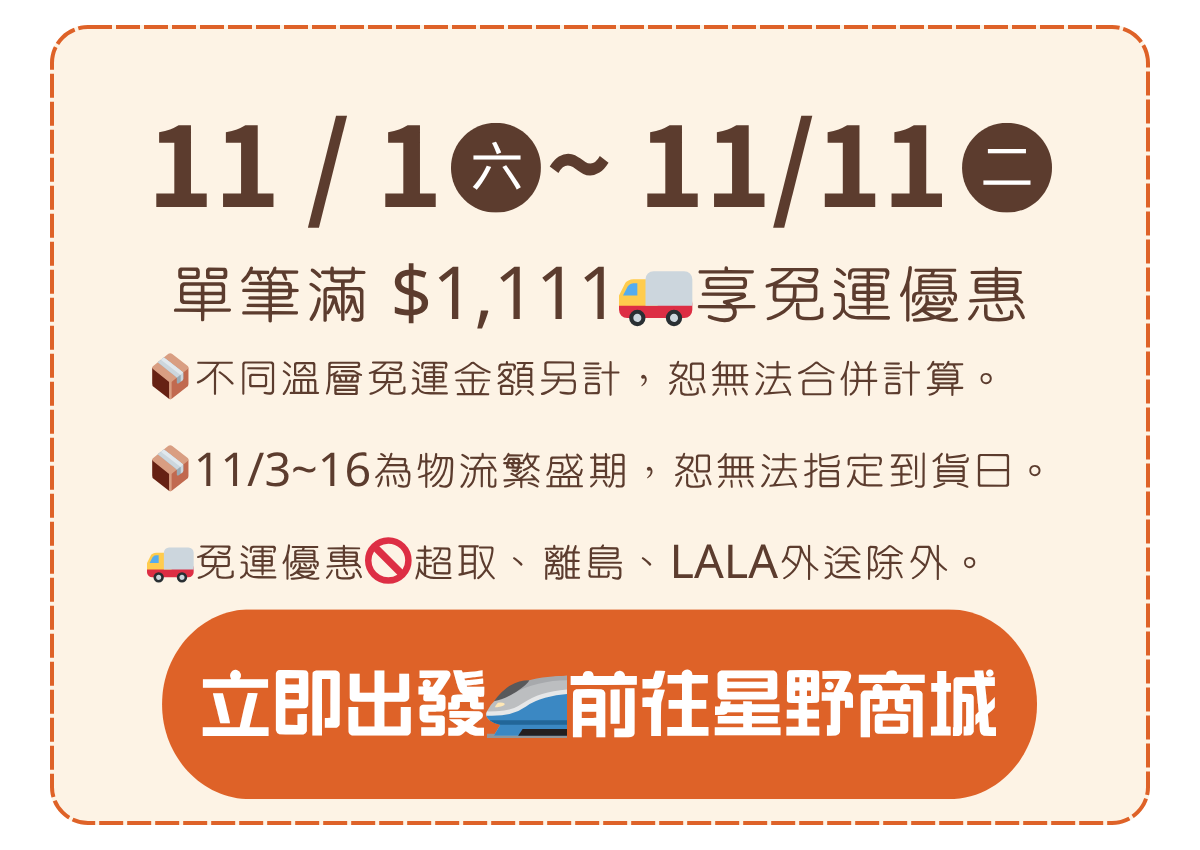 🛍️ 雙11活動即將開跑🎉,11/1~11/11"同溫層"結帳金額滿1111元即可享有免運優惠🚛 ※ 超取、離島、LALA外送,除外
